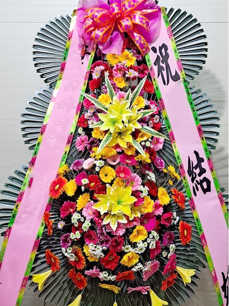 탁구회원분의 결혼을 축하하기 위한 3단화환